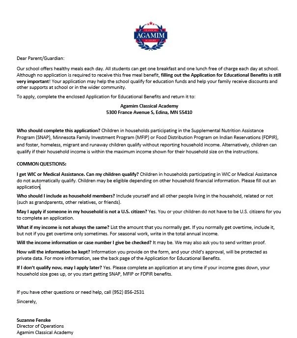 Applications are available on the Agamim website and must be submitted each year. If you qualify for free/reduced lunch, you still must order specific mails for each day online to ensure your child receives the breakfast and lunch they want.